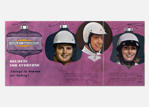By the 1950s and ’60s, helmets as we think of them today were taking shape, firmly established as safety gear. In the first years that Harley-Davidson offered a hard-shell helmet, two of three total choices were aimed specifically at police officers and racers; H-D catalogs the gear was often called “safety helmets.”
