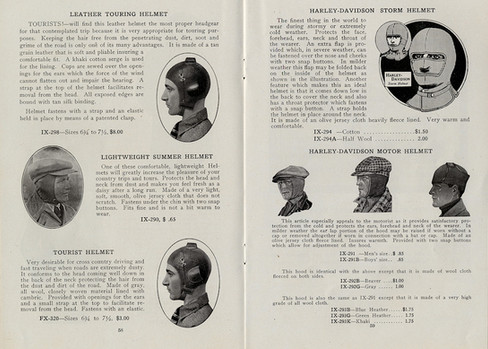 Through the 1910s, several different and distinct headwear items could be purchased from the Harley-Davidson Accessories catalogue, each with a different purpose. Among them were the "Heather Jumbo Knit Cap" (75 cents), the "Aeroplane Cap" ($1.50), as well as a unique piece called the "Tourist Hood" ($2.50), an item meant for "cross country driving and fast traveling" that was to keep dust and dirt out of one's hair.